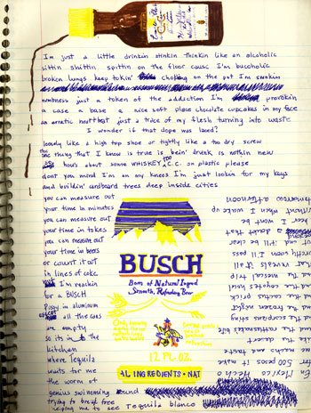 I'm just a little drinkin' stinkin' thinkin' like an alcoholic sittin' shittin' spittin' on the floor 'cause I'm bucolic broken lungs keep tokin' chokin' on the pot I'm smokin' numbness just a token of the addiction I'm provokin' a case a bass a nice soft place chocolate cupcakes in my face an erratic heartbeat just a trace of my body turnin' into waste I wonder if that dope was laced? loosely like a high top shoe or tightly like a too dry screw the one thing that I know is true is bein' drunk ain't nuthin' new so how about some whiskey too! CC on plastic please don't you mind I'm on my knees I'm just lookin' for my keys and buildin' cardboard trees deep inside cities you can measure out your life in beers you can measure out your life in tokes you can measure out your life in years or count it out in lines of coke but I'm reachin' for a Busch pussy in aluminum but all the cans are empty so I go into the kitchen where tequilla waits for me the worm of genius swimming 'round tryin' to break free helpin' me to see tequilla blanco en Mexico hecho for five hundred pesos it makes me macho and tastes like the desert and the rattlesnake's bite and the scorpion's sting and the frozen night and the cactus' prick and the coyote's howl and the mescal trip that reveals it all so pretty soon I'll pass out but it'll be clear beyond a doubt that a beer I won't be without when I wake up tomorrow afternoon |