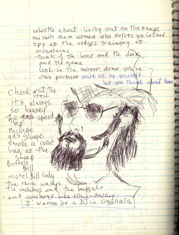 There are only two radio stations in Western Nebraska both of them the purest distilations of radio inanity middle American boredom and insanity so if you're driving West into the endless apaloosa blue of clouds past the horses waving in the wind the rivers flowing warm with life the hay in rolls and tufts of trees and the yellow topped corn like a crew cut on the plaine then you have to sing for yourself and for the truckers hard at dreaming families in busses rolling by blackbirds streaking in the sky and little boys with virgin eyes that marvel at the wilderness the blue lakes still the hay green hills most of man must surely miss the quiet sweet sincerity of a powerful sky and anxious trees rivers overflowing need distance space tranquility so dream like the truckers of cowboys look for the Platte whistle about living out on the range missing them women who drive you insane spy at the ridges training at mountains look for the bear and the deer and the game look in the mirror and draw your own picture you're all by yourself but you think about fame check out the foot it's always so heavy check out the map speed, milage, gas gauge baa at the sheep Buffalo Bill Motel Bill Cody the rain washes the Indians and the Buffalo and the cowboys like time away |